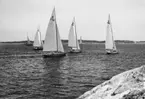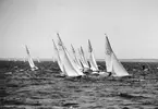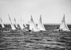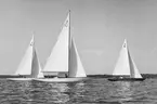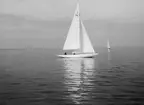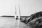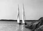 Reportage från Sandhamn under sandhamnsregattan 1941. Den nordiska seglarfesten. Med en fläkt från sol, sommar och Sandhamn. Två segelbåtar i tävlingen.