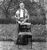 Jordgubbsplockare, 20 augusti 1965 En bild på en kvinna som plockar jordgubbar på jordgubbsfältet en solig dag. Hon bär en kortärmad sommarklänning samt har en sjalett på huvudet. Vid sidan om henne står en korg innehållande kartonger att lägga jordgubbar på.