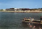 Barn och vuxna badar i en sjö. På strandkanten ligger en motorbåt med åror.