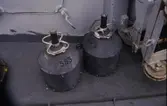 Göteborgs örlogsdepå. HM Hjvb 384:s resa. Vid piren vid Göteborgs örlogsdepå ligger ett annat hjälpfartyg till bredvid Hjvb 384. Bilden visar det andra fartygets svepsluss. Bojarna vid vardera sidan äro svepbojar. Framför stb:s boj ses en på kant stående sjunkbomb med påsatt kapell. Fil Gunnar Jonssons undersökningsresa till västkusten juni 1940. 198