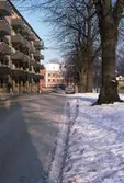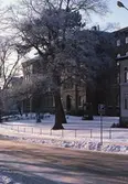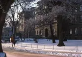 Foto över Skeppsgossekasernens östra fasad. Byggnaden är ritad av arkitektbröderna Axel och Hjalmar Kumlien och uppfördes mellan 1878-1881. Byggnaden har putsad fasad med kraftigt rusticerad bottenvåning och avslutas mot taket av en rundbågefris. Fasaden delas även upp av tre risaliter. Taket täcks av falsad plåt. Fönster- och dörröppningar är rundbågiga, förutom på den översta våningen där muröppningarna är raka.