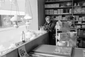 "Kunden Henny Nilsson från Ljungskile vid skyltfönstret vid norra gaveln. Henny brukar handla mycket här. "En trevlig affär för allt möjligt". På bilden syns också Nils Antonsson"