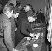 Ortopeden 28 februari 1966 Två herrar tillverkar hjälpmedel för fysiskt handikappade. De står vid en stor arbetsbänk. På denna finns två stycken skruvstäd samt modeller av gipsfötter.