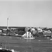 Tvåmastad slätskonare, troligen Ägil ex Sleipner, regnr 3035, med stor flaggning, i Uddevalla hamn. Briggen Emil i bakgrunden."