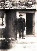 "Rök-Olle" (Johan Andersson) utanför sin stuga på Järpet i Floby. Där rökte de korv och fläsk. Han kallades även "Olsa-Johan" och "Slev-Olle" (med anledning av att han snidade träslevar). Obs. att han har en "vardagstoffel" och en "härdastoffel" på sig.
