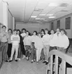 Sju personer i färd med att dyka i vattnet i samband med en simtävling vid Saltö badvik. Runt omkring, samt på de omgivande klipporna, står och sitter flera åskådare i blandade åldrar. Flera personer är klädda i badkläder.