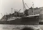 Foto i svartvitt visande hamnbild från Stadsgården i Stockholm, vid kaj lastmotorfartyg "Hansa" av Hamburg.