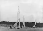 Från starbåtarnas uttagningsseglingar i Sandhamn 21 juni 1936 till OS-seglingarna i Kiel i augusti. Svenska Seglarförbundet hade uppdragit arrangemanget av dessa uttagningsseglingar åt KSSS. De båtar som kan identifieras på bilden är Daniel Sundén-Cullbergs 915 SUNSHINE i förgrunden t v samt Dag Sundén-Cullbergs 1014 MOONSHINE längst t h.