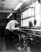 "Stickmaskinen justeras" (Ottossons textilfabrik). Från utställningen "Falköping i bild" 1952.