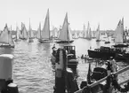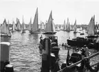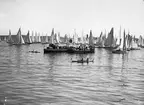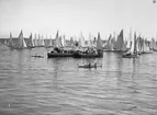 "Reichsportführer [sic] von Tschammer und Osten - han som tittar på armbandsuret - omgiven av amiraler, SA-gruppenfuhrer [sic] och SS-dignitärer vid Kiel-regattans öppnande"