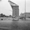 Röjningsarbete. En traktor på larvfötter (caterpillar) forslar bort ett träd som blåst ner intill bostadshuset i Ölmevalla, under höststormen 1969.