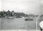 Stockholm, Skeppsbron omkr. 1900. Utsikt från Skeppsholmen mot Kungl. slottet. Bild av badhuset på Skeppsholmen.