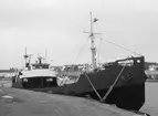 Foto i svartvitt visande hamnparti från Strömstad, Vatuland. T.h. i förgrunden okänd lustjakt och i bakgrunden järnvägsvagnar samt bebyggelse.