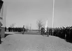 "Sorgetåget passerar studentkårens paraderande fanborg", professor Rutger Sernanders jordfästning, utanför Uppsala domkyrka, Uppsala november 1944