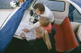 Marknadsföringsbild för Albin 25. Man, kvinna och pojke tittar på sjökort i doghouse.