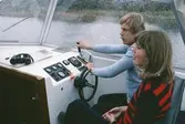 Kvinna, man och pojke i doghouse på en Albin 25. Marknadsföringsbild.