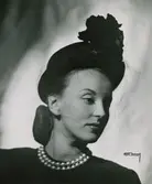 Kvinnlig modell med hatt av Suzanne Talbot. Mauvefärgad velour, med garnityr och flor. Nordiska Kompaniet, Stockholm.
