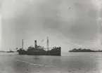 Lastångfartyget SCHENECTADY på väg till östra kajen Fredriksskans. Båtsman Bergman i ekan.