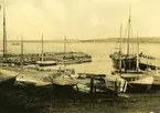 'Båtar i hamnen vid Torekov. 2 st hus vid hamnen. :: :: Ingår i serie med fotonr. 2167-2179.'