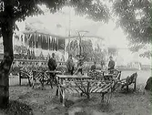 "Utställning vid Varbergs Societetsrestaurang." Några män i kubb står bland trädgårdsmöbler utanför Societetshuset.