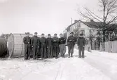 Blomqvists tunnbinderi på Ängö. Erik Blomqvist berättar om bilden: "...från vänster en yngling som håller på att resa en "drittel" (tyskt ord) vid sidan om honom står min farfar N. G. Blomqvist som håller handen på en färdig drittel. Nästa man är min far Karl Blomqvist som håller på att nita ett band till en ekkagge. Något bakom honom vid fönstret står en morbror Axel Franzen och sedan står Albert Blomqvist, som sedan blev den sista ägaren av verkstaden. Framför honom står halvfärdiga ekkaggar, mannen längst till höger är i färd med att tillverka sillfjärdingar, längst till höger syns två färdiga kaggar".