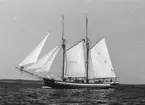 Kontaktkopia av ett fotografi från en tvåmastad skonert av liknande typ som övningsfartygen Gladan och Falken. Fartyget ligger till ankars. På babordssidan syns det två skeppbåtar.