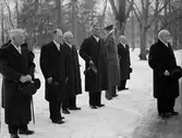 Firandet av Lantbrukshögskolans tioårsjubileum, Ultuna - i första raden rector magnificus Thore Engströmer, universitetskansler Östen Undén samt statsråden Axel Pehrsson-Bramstorp och Per Edvin Sköld
