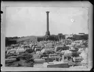 Bilden förställer Amiralitetstorget med Klockstapeln i Karlskrona. Bilden är troligen tagen i samband med fregatten Vanadis avfärd till världsomseglingen 1883.
