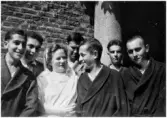 "Karantänsförläggning" på Kvarnbyskolan för flyktingar från koncentrationsläger i Tyskland 1945. Sju manliga flyktingar med två sköterskor utomhus.
