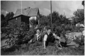 "Karantänsförläggning" på Kvarnbyskolan för överlevare från koncentrationsläger i Tyskland och Polen 1945. Skolan fungerade under denna sommar som beredsskapssjukhus. Tre välklädda unga män (flyktingar) sitter eller halvligger i gräset. Abraham Frischer (1923 - 2009) ses längst till höger. Männen ler och verkar ha trevligt tillsammans. I bakgrunden ses små bostadshus.