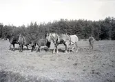 EN MAN PLÖJER MED HJÄLP AV TVÅ HÄSTAR.