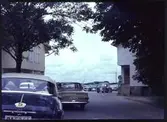 Lyxvillor 25 maj 1966 Landsvägen genom Lillån. Riksväg 50 norrut. Kåviskylt i bakgrunden.