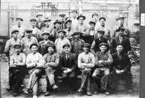 Garphytte Sanatorium, två och en halvvånings sjukhusbyggnader i sten. Arbetargrupp 44 män. Andra raden uppifrån, tredje personen från höger i skärmmössa och med mustasch är muraren Vitus Westman (1884-1963) från Hjo.