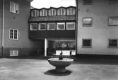 "Gården i Folkskolan, Laholm." I förgrunden ses en fontän med en skulptur av Stig Blomberg i form av sittande pojke. I bakgrunden ser man två byggnadskroppar med en förbindelsegång upptill. Förlag: Einar Lindgrens Bokhandel, Laholm. Till bilden finns följande färgläggningsinstruktion: "Denna bild skall färgläggas enl. färgfilm XM383. Byggnaden till vänster blir brun och till höger grå. Mittenpartiet blir blått med rött tegeltak. Sockeln till vänster är gråblå till höger svart."