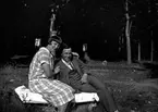 Ett äldre par sitter i en soffa, kvinnan har en blomsterbukett i knät. De ler mot varandra.