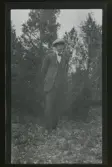 "Gustav Hjälte, Berlin." Porträtt av en målare i kostym och keps.