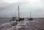 Fotografi ur Detlow von Brauns album. Segelbåtar och sällskap i naturhamn.