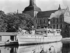 Stereobild av bro och kanalbåt/ gondol vid Pont de Rialto.