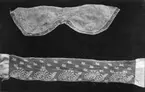 Broderi i korssöm, märkt "19 Å...", bård av knypplad spets, kläppfrans.