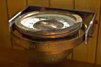 Kompasstativ med fiskfötter. Kompassen intakt inkl. glaset. I bakgrunden syns däckshuset.