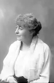 Kvinna i pälsjacka. Reklam för L. Haglund & Co, med varumärket Elhå. Grundades som en affär för mössor, hattar och pälsvaror av Lars Haglund 1872. Fotografiet är taget utanför entrén till Strömvallen på Kungsbäcksvägen 23.