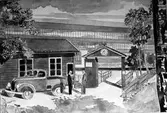 Morgårdshammars Mekaniska Verkstad. Maskinverkstaden och montagehallen, med en gemensam längd på 160 meter. Närmast på bilden gamla portvaktstugan och ett provrum.