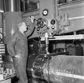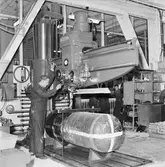 AB Motorrenovering, interiör från maskinhallen, radialborrmaskin för motorblock.