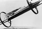 Raketpostexperiment, troligen i USA. Postraketen "Gloria" färdig att skjutas iväg från rampen. Repro efter tidningsillustration med raster