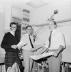 Trumslagarbacken, Västerås. Arbetsbild från Vallbygrävningen 1958. Äldre man i väst, glasögon och hatt mäter något med måttband. Yngre man i rutig skjorta sitter vid provisoriskt ritbord och skriver troligen in måtten på karta.
