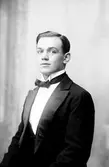 Ateljébild på en man som har tagit studentexamen. Han har en smoking, studentmössa och studentkrans på sig. Enligt Walter Olsons journal är bilden beställd av Liss-Erik Björkman.