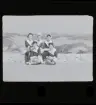 Två kvinnor arbetar utomhus bland stenar med spett och borste.