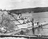 Rosa Pettersson (född Krantz) och kusinen Arnulf Thorvaldsen (från Tönsberg i Norge) kastar varpa, 1930-tal. De är vid Tulebosjöns badplats som användes av personal och boende på Steretered. Relaterat motiv: 2007_0007 (Mölndals stadsmuseum).