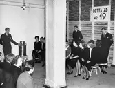 "Provsittning i luftskyddsrum No 19 under det stora generalrepet.Utrymmet är rikligt - både med tanke på disponibel golvyta och luftkub för varje besökare." Nordiska Kompaniet.