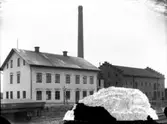 "Brödfabriken och sädesmagasinet, 1906". Banområdet vid Enköpings järnvägsstation, vy från sydväst. Troligen de byggnader som hästbrödsfabriken BendOr hade verksamhet i 1897-1906.